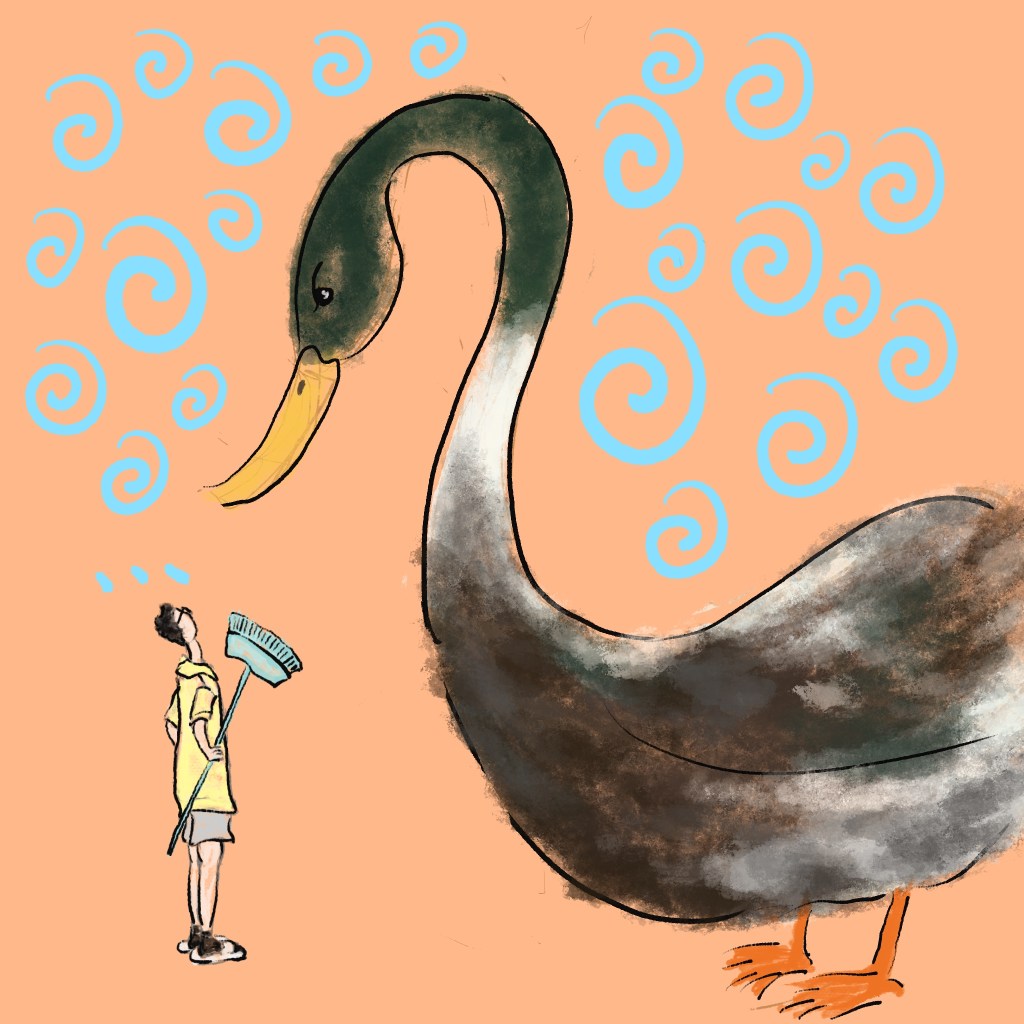 在临走的时候,朋友展示了一段赶鸭子戏水的情节,他手里的扫帚就像音乐家的指挥棒一样,只要在鸭鸭身后轻轻一挥,小鸭就能从善如流地从岸上滑入水池中。但是把鸭鸭赶回家就变得困难重重,它在岸边左右徘徊,一会儿飞到凉亭下,一会儿又跳到菜田里,朋友只能在一旁叉起腰静静看鸭鸭表演,扫帚在此刻失去魔法,又变成了一把普普通通的蓝色塑料扫帚。