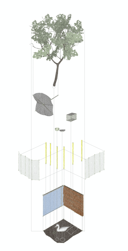 除此之外,鸭舍内的一角还有一颗小树,天热的时候为鸭子提供一片树荫,但是看起来不太能挡雨的样子,但是意境到了。树干上还搭着一把被天堂伞,但是已经被风雨摧残到七零八落。也许搭伞最初的设想就是为了给鸭子挡雨,但是现在这把伞已经被塑成了风的形状,俨然变成了艺术装置一样的存在。