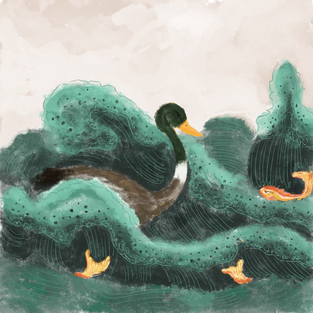 当然,鸭子在水里也怡然自得,它在水上扑簌着翅膀,把头飞快地伸到水下喝水,大动作溅起一圈圈水花,有时候玩得高兴了还会潜入水底,轻盈地穿梭其间,把水里的小鱼们搅得不得安宁。除了小鱼外,小院中偶尔会有松鼠光顾,不过看样子它和鸭子应该交流不是很多。朋友有一次去博物馆,看到博物馆庭院里养了一群白花花的大鹅,他也会念叨着自家鸭子说不定会跟这群大鹅做朋友。我问鸭子的最终归属会是哪,他盯着西湖的湖面喃喃道:“也许会放到西湖吧,做一只快乐的野鸭子。”