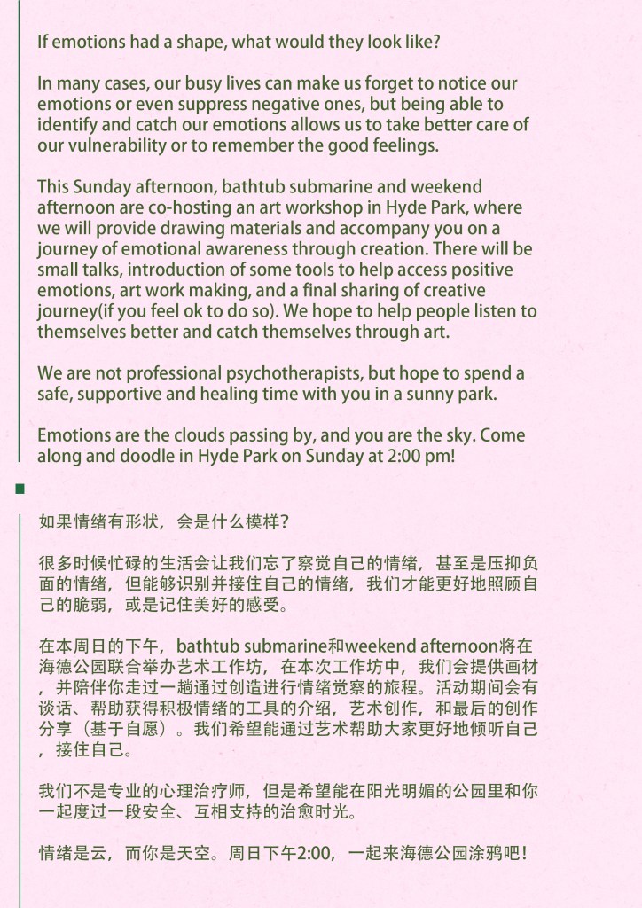 The workshop was not only an opportunity for learning and creativity, but also a platform for mutual exploration and exchange. We collectively strived to build a bridge between art and mental well-being, whether on the grassy field of Hyde Park or in the indoor space. Our joint efforts and exploration contributed to personal growth and unity. This collaboration with Jiqiu, and potentially with other partners in the future, holds great significance. It has allowed us to build bridges between art and psychological health, inspiring each other and expanding our horizons.