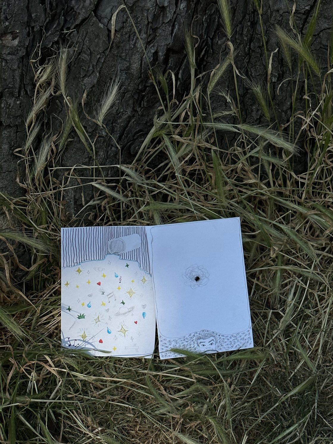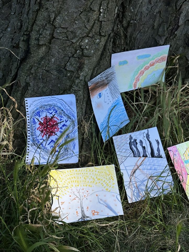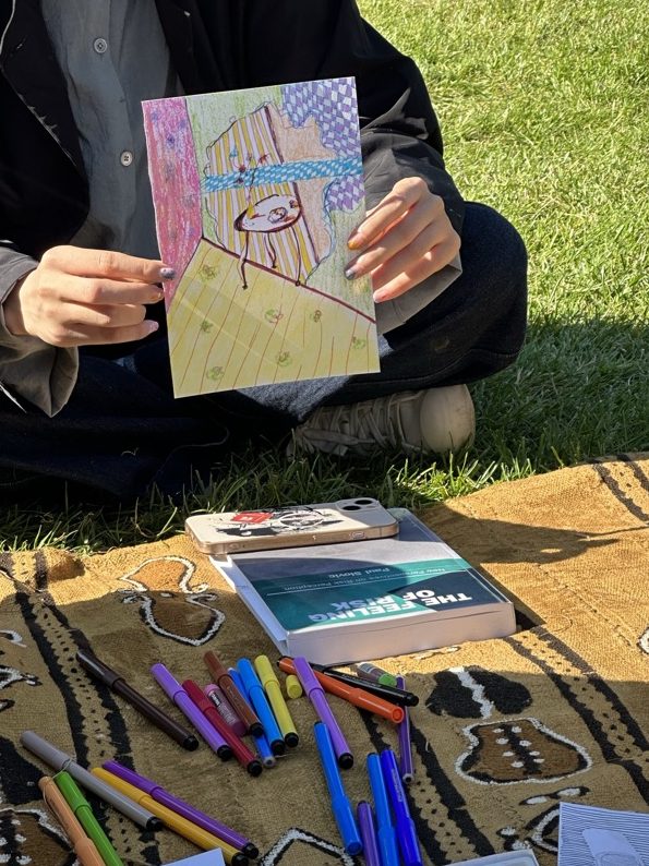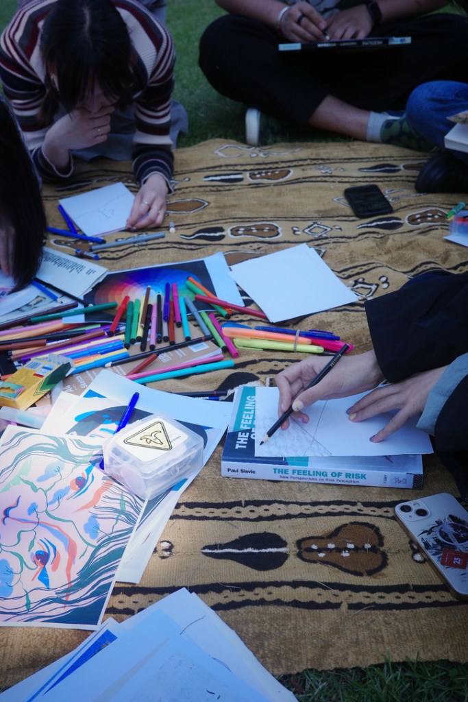 The workshop took place in a grassy area within Hyde Park, surrounded by lush trees, creating a secluded environment. This setting provided a warm and intimate space for participants to relax and engage in sharing. The workshop attracted the participation of seven individuals, including those struggling with eating disorders, individuals with anxiety disorders, and art students burdened by academic pressures. These participants were passionate about art and creativity. We gathered together on that patch of grass, utilizing painting, illustration, and other artistic forms to explore the theme of eating disorders.