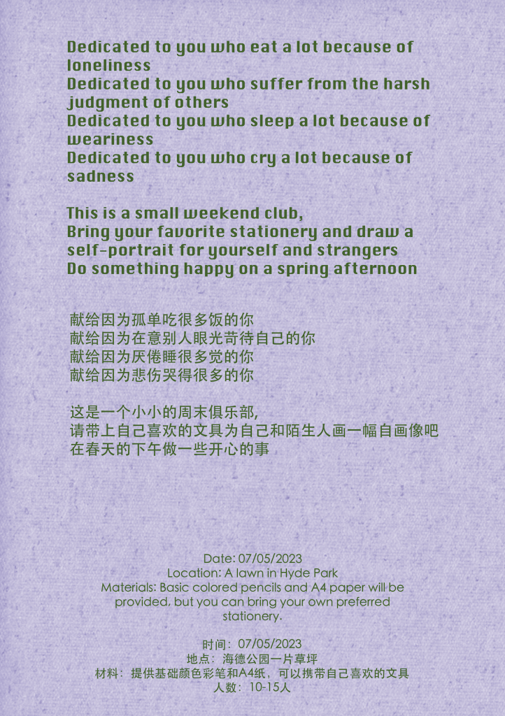 In May 2023, I started organizing small art therapy workshops in London, inviting individuals with eating disorders or anxiety to participate in painting activities. I named the workshop “Weekend Club” with the aim of creating a relaxed and enjoyable atmosphere where participants could feel free to join without any burdens. Currently, the workshop has been held twice, with the first workshop focusing on self-portraits and the second workshop exploring emotions through painting.