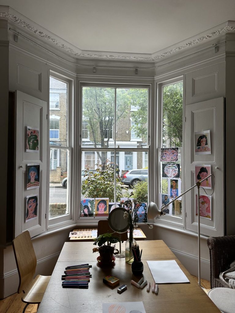 2023年5月,我开始在伦敦举办小型的艺术疗愈工坊,邀请有进食障碍或焦虑问题的人群参与绘画活动。我给这个工坊取名为“周末俱乐部”,旨在创造一个轻松、愉悦的氛围,让参与者感到无负担地融入其中。工坊的目标是提供一个安全、包容的空间,通过艺术表达来探索情绪和自我。