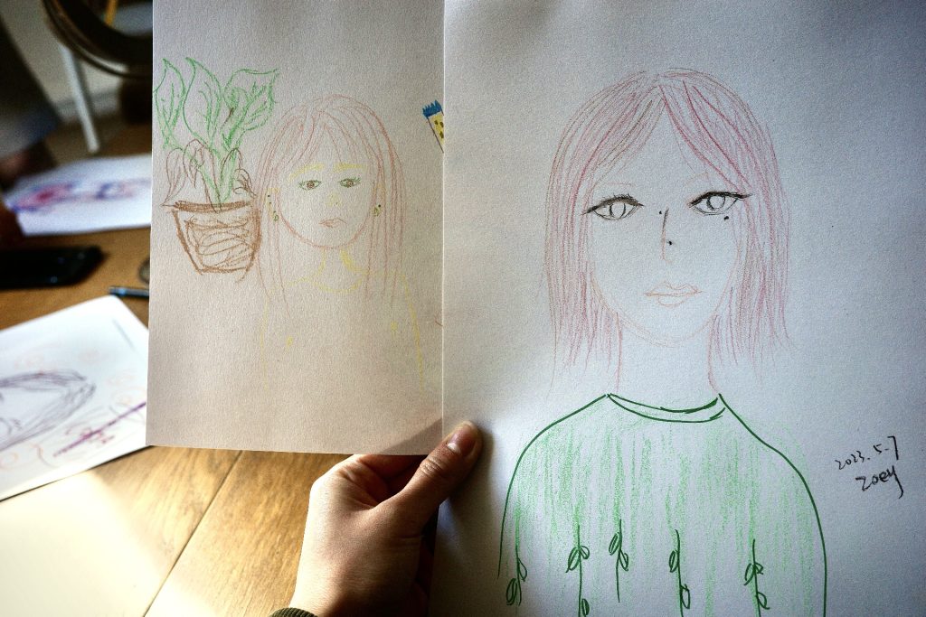 在这个工坊中,参与者有机会通过绘画来表达内心的情感和体验。第一次工坊的主题是绘画自画像,参与者用画笔和颜料勾勒出自己的形象,并在画作中展现出个性和情感。这个过程不仅让参与者与自己建立了更深入的联系,也为他们提供了一个自我表达的机会。