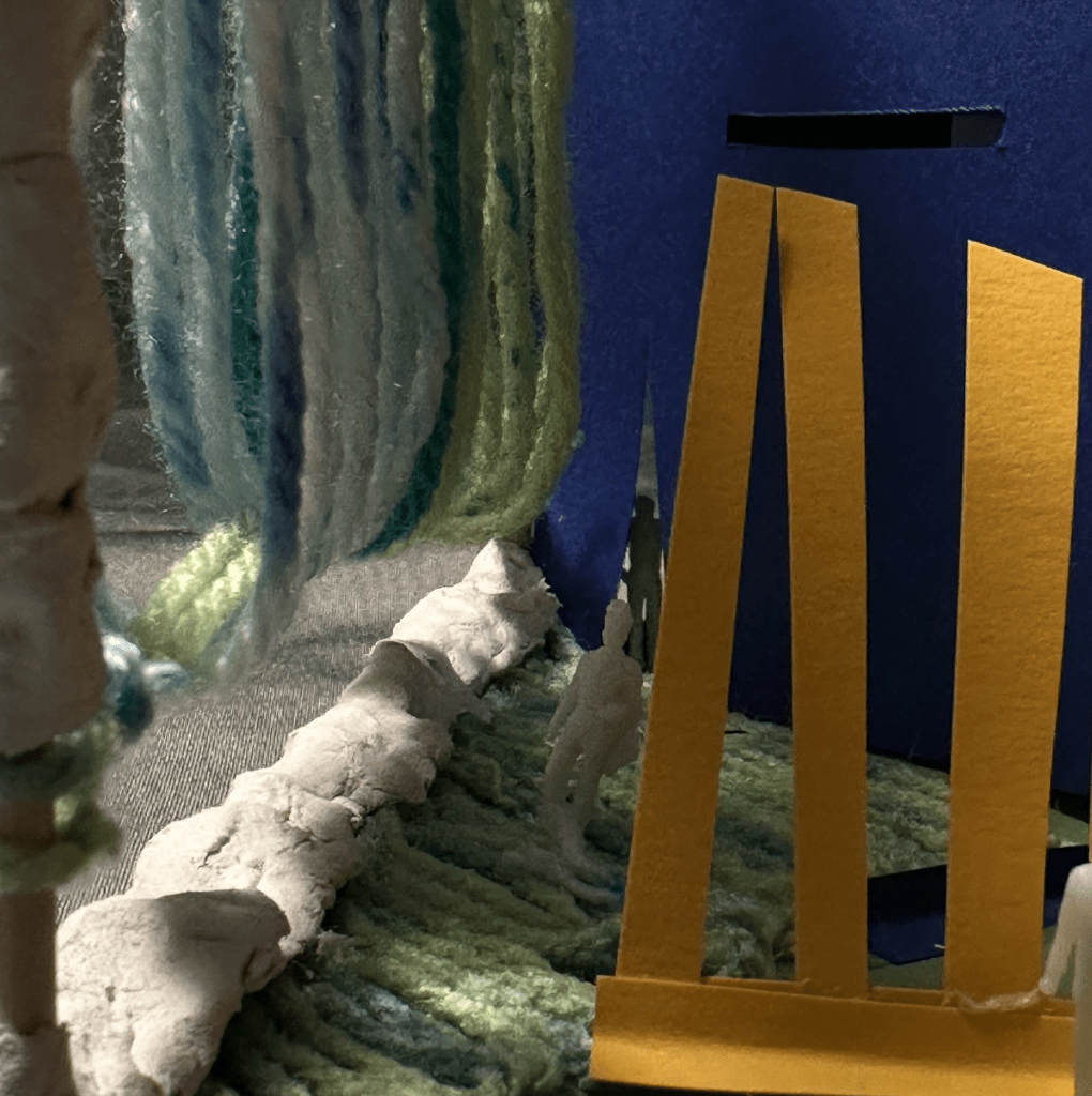 During the early stages of the project, I utilised my knowledge of architecture to create a conceptual model for eating disorders. I constructed a cube-shaped wooden framework and divided it into four sections inside, representing the four major stages of the eating disorder journey: “Sick,” “Incident,” “Recover,” and “Normal.” I used various materials such as cardboard, yarn, fabric, and more to depict these stages. Light and colour became the model’s primary elements, signifying each stage’s emotional and transformative aspects. This model served as a medium to share my experiences and thoughts, allowing viewers to gain a deeper understanding of the process and complexity of eating disorders.