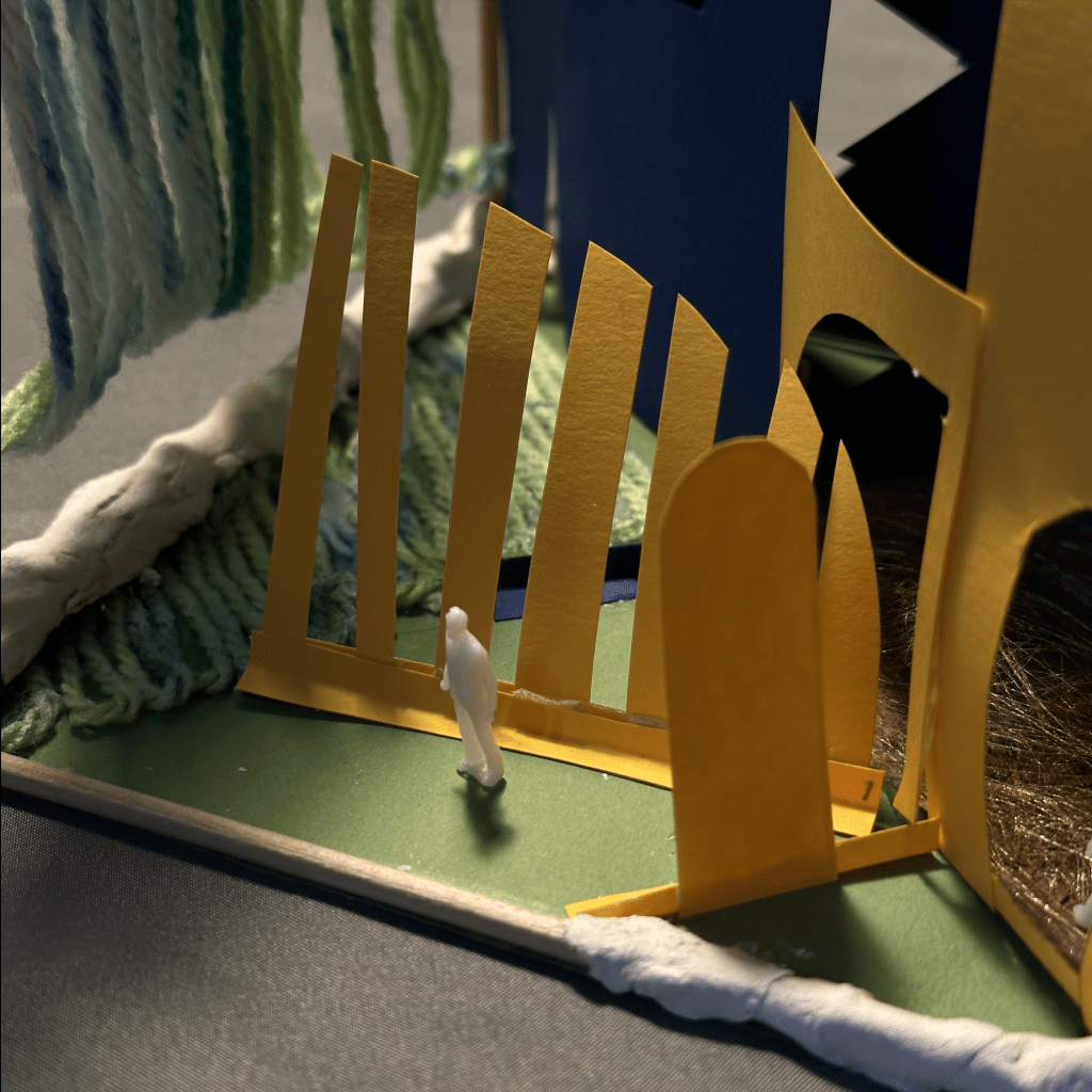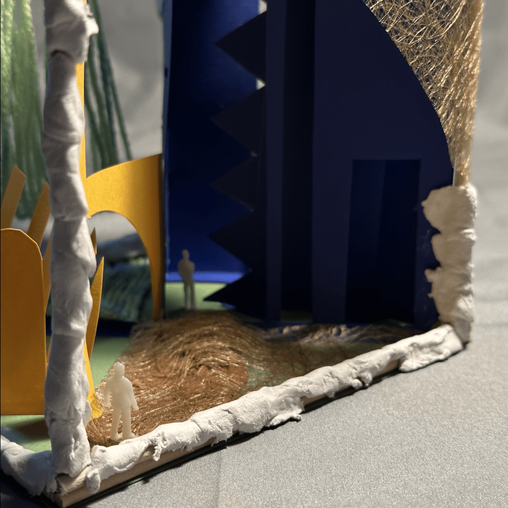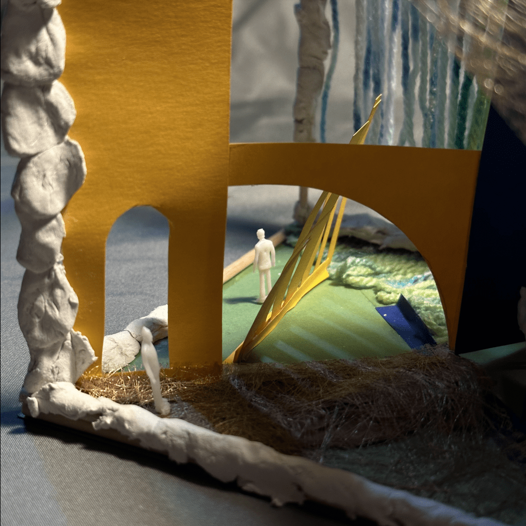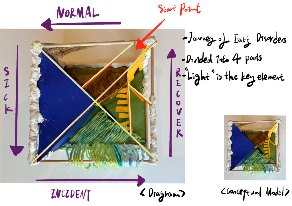 在项目早期,我利用建筑学知识创建了一个概念模型,以表达进食障碍的过程。我构建了一个正方体木框支架,并将其内部分割为四个部分,代表进食障碍的四个主要阶段:病态(Sick)、转折(Incident)、复原(Recover)和常态(Normal)。我运用卡纸、毛线、布料等多种材料来呈现这些阶段。光线和颜色成为模型中划分步骤的主要元素,通过它们来表达每个阶段的情感和变化。这个模型成为我讲述个人经历和思考的媒介,让观者能够更深入地理解进食障碍的过程和复杂性。