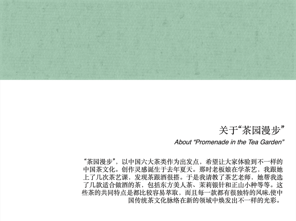 “Promenade in the Tea Garden” is the third season’s cocktail menu at Hedwig. We dedicated nearly a year to designing and preparing this theme, constantly revising it to find the best way to showcase the fusion of Chinese tea and alcohol.